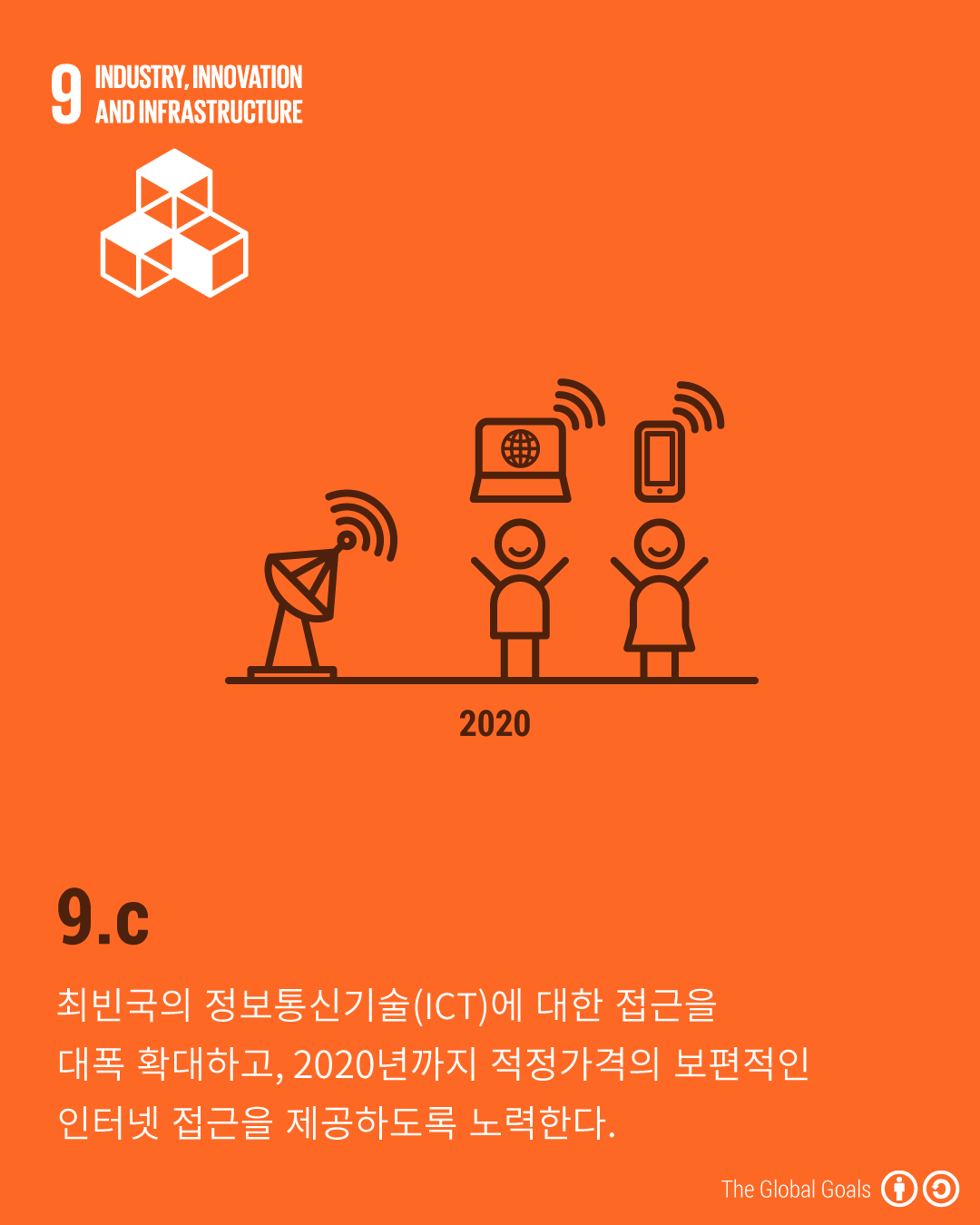 - 9.c - 최빈국의 정보통신기술(ICT)에 대한 접근을 대폭 확대하고, 2020년까지 적정가격의 보편적인 인터넷 접근을 제공하도록 노력한다.