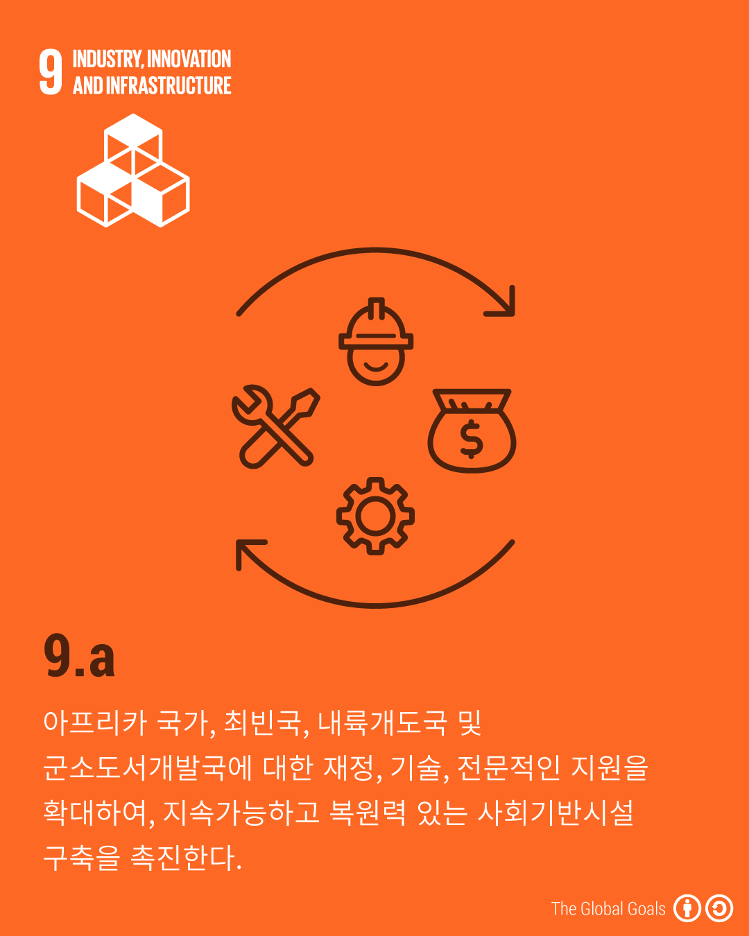 - 9.a - 아프리카 국가, 최빈국, 내륙개도국 및 군소도서개발국에 대한 재정, 기술, 전문적인 지원을 확대하여, 지속가능하고 복원력 있는 사회기반시설 구축을 촉진한다.